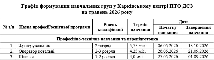 Харківський центр професійно-технічної освіти Державної служби зайнятості оголошує набір слухачів на навчання за професіями відповідно до графіка формування груп у травні 2026 року.