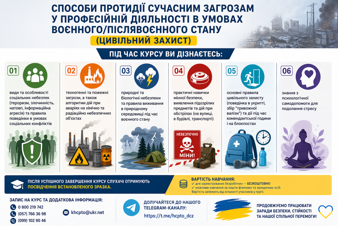 Харківський центр професійно-технічної освіти Державної служби зайнятості запрошує всіх на навчальний курс за освітньою програмою: «Способи протидії сучасним загрозам у професійній діяльності в умовах воєнного/післявоєнного стану» (цивільний захист).